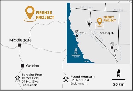 The 740-hectare Firenze property is located in central Nevada, 170 kilometres east of Reno (Figure 1). The claims are located on road accessible BLM-managed ground with no conservation designation.