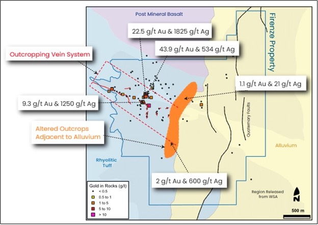 Precious metal grades and argillic alteration are open to the east beneath shallow, post-mineral alluvium. This covered area hosts a structurally complex fault accommodation zone that may be the focal center of the epithermal system.