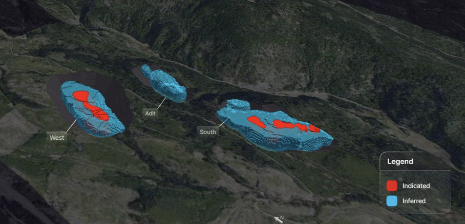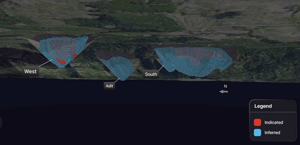 - West and Adit deposits host high grade mineralization from surface while South is a larger bulk tonnage deposit over one kilometre in length and underexplored