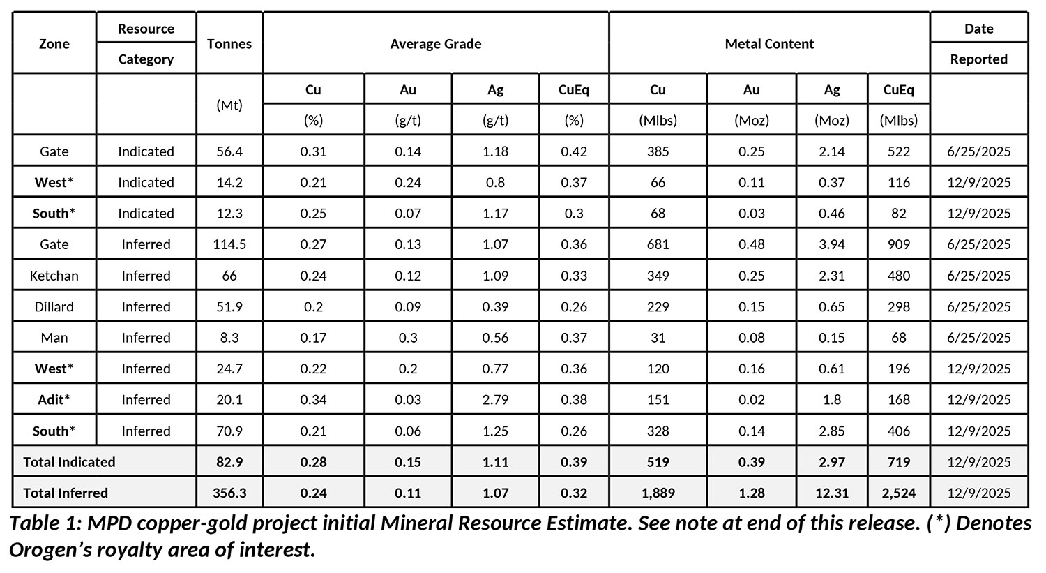 - Total Indicated Mineral Resources at MPD of 82.9 million tonnes (“Mt”) grading 0.39% copper equivalent (“CuEq”) for 519 million pounds (“Mlb”) of copper and 0.39 million ounces (“Moz”) of gold, of which 134 Mlb copper and 0.14 Moz gold is attributable to Orogen's royalty area of interest1